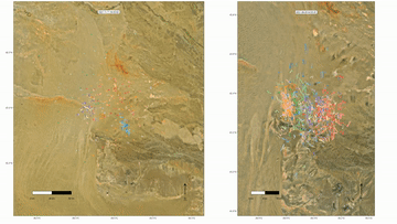 新疆卡拉麦里山有蹄类野生动物自然保护区,佩戴卫星项圈的普氏野马在冬季(左)和夏季运动模拟路线。新华社发
