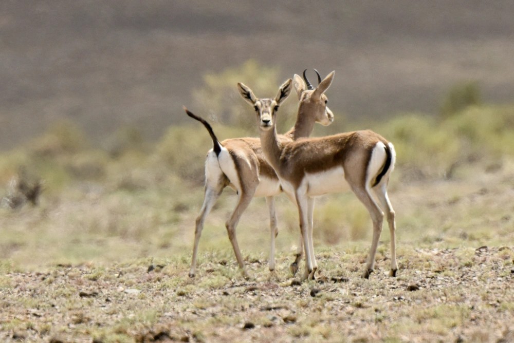 两只鹅喉羚在新疆卡拉麦里山有蹄类野生动物自然保护区四处张望(2020年6月6日摄)。新华社记者 丁磊 摄
