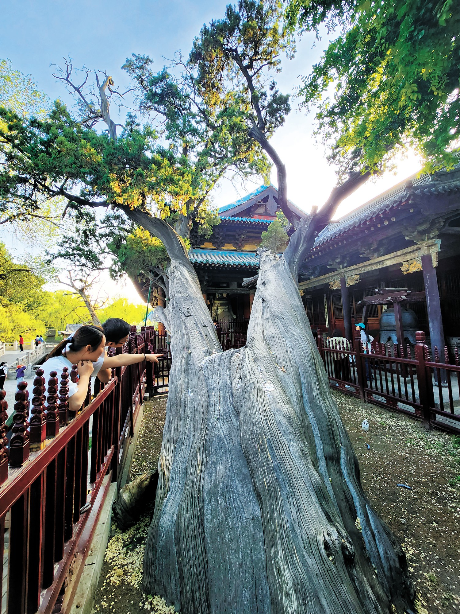 凑近细观,更觉其风骨不凡。苍褐色的树皮如古玉皴裂,深沟浅壑纵横交错,最深处的裂纹竟能容下孩童的手掌,那是三千年风雨刻下的年轮密码。我伸手轻触,树皮粗糙坚硬,指尖能清晰感受到纹路的起伏,像是触摸着一部立体的史书。抬头望去,枝干虽已半伏,却仍有无数虬枝倔强地伸向天光,托举着层层叠叠的新绿。新叶嫩得透亮,在阳光下泛着微光,与深褐的老枝形成鲜明对比,宛如老者鬓边的新霜,透着生命的智慧。“它这姿态好似故意的。”我的好朋友、山西省古树名木保护资深专家、晋祠古树的守望者张树民走过来,指着树干向南的方向说,“晋水就在南边,它往南倾斜好像是为了更贴近水源滋养根系吧。而且你看,它的枝丫特意避开了圣母殿的屋顶,既不破坏古建,又能借殿宇挡风遮雨,这是它和古建的默契。”我赶紧按下快门,从仰角定格下“老枝抱新绿”的全景,又蹲下身拍摄树皮的细节。镜头里,飞檐的斗拱与树冠的枝叶相映,古建的庄重与古树的灵秀在光影中完美交融。