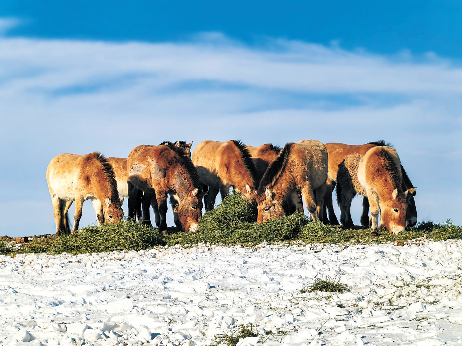 到了野马开饭的时间。它们这个时候最黏人,尤其是去年新放归的两匹野马,主动迎上去欢迎远方的客人。它们凑近客人,好奇地嗅着,像是在打招呼。可是吃饱喝足后,它们又不大理人了,各自散开,该去忙自己的事了。