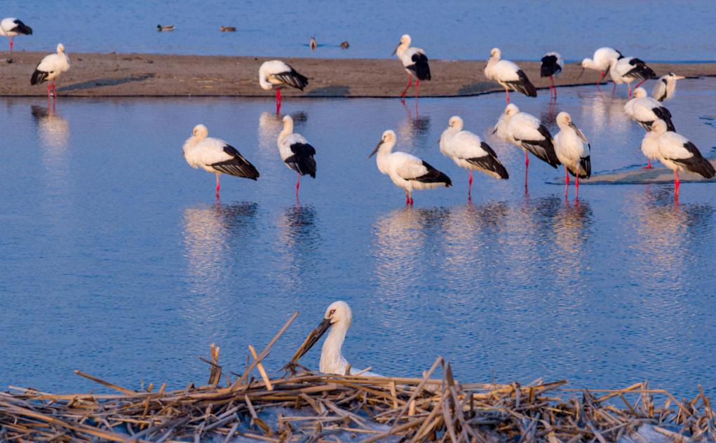 3月19日,在黑龙江省哈尔滨市一处水域拍摄的东方白鹳(无人机照片)。新华社发(刘大鹏 摄)