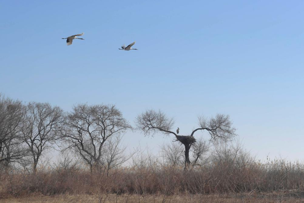 3月28日,在黑龙江省齐齐哈尔市克钦湖湿地,两只丹顶鹤在东方白鹳巢上空飞过。新华社发(王勇刚 摄)