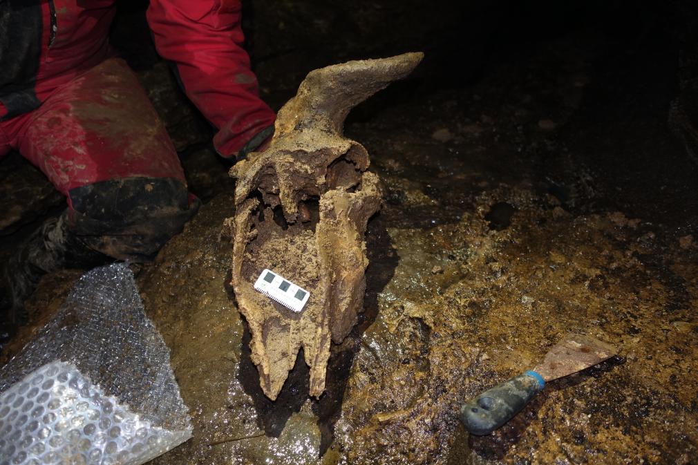 这是在贵州绥阳双河洞发掘现场发现的羚牛头骨。(受访者供图)
