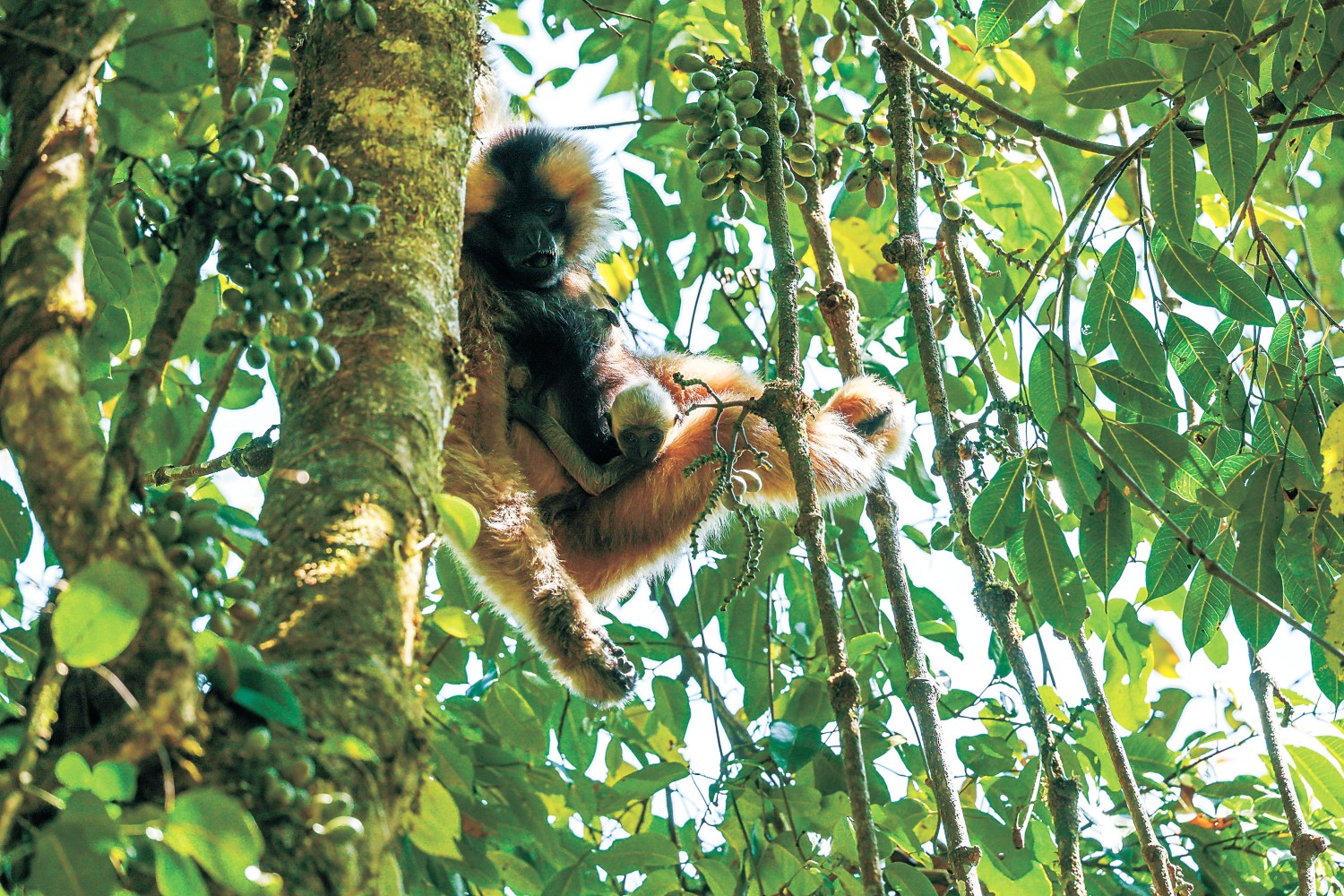 西黑冠长臂猿妈妈怀抱幼崽