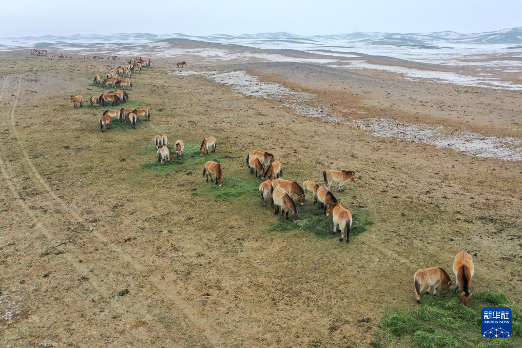 在新疆卡拉麦里山有蹄类野生动物自然保护区乔木希拜普氏野马监测站,等待野放和返回补饲的普氏野马在围栏内吃草(2月4日摄,无人机照片)。