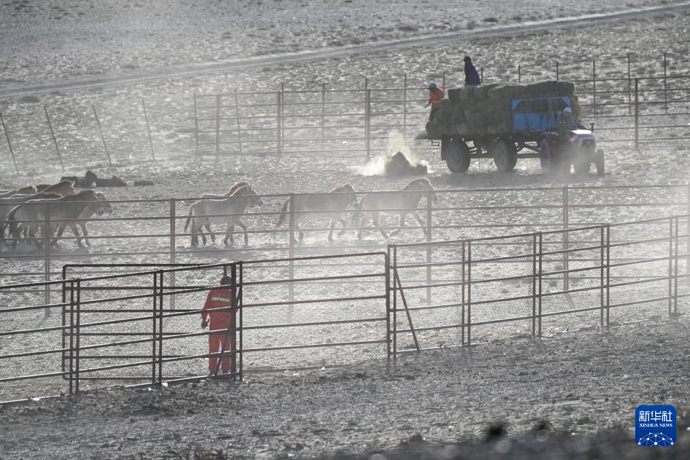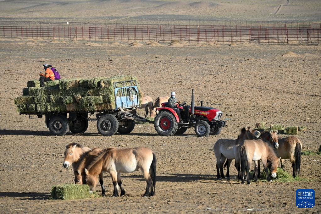 在新疆卡拉麦里山有蹄类野生动物自然保护区,工作人员为普氏野马投放草料(4月21日摄)。