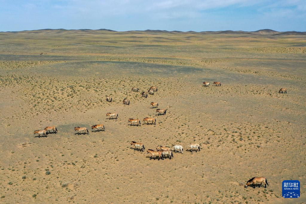 这是在新疆卡拉麦里山有蹄类野生动物自然保护区拍摄的回归野外的普氏野马(4月22日摄,无人机照片)。