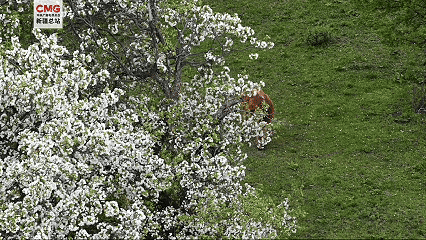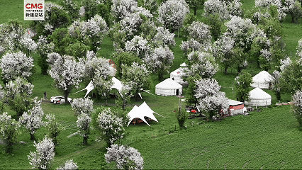 从空中俯瞰,粉白繁花漫山覆谷,与苍翠云杉、含雪远山相映成趣;林间空地被青草铺绿,落英纷飞,尽显春日灵秀。