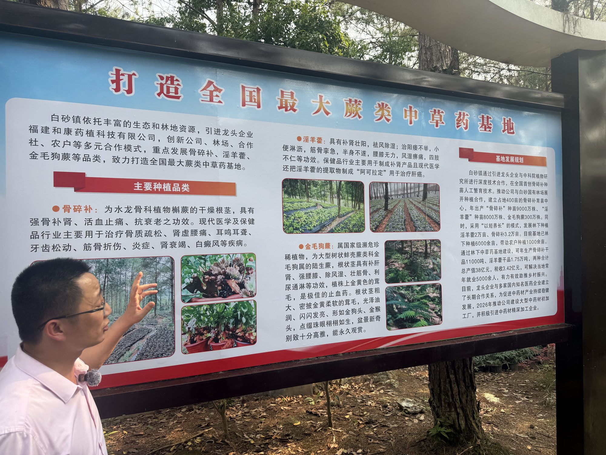 陈丽琴:我们总体的“飞地”林地建设的规模是在1000亩,一期现在投入了300亩,后面比如说一些没有资源的村子,包括林农他们愿意来的,我们帮他们安排了林地,他们到时候买一些苗过来种就可以。现在我们是以“一促二带三”,目前种植面积达6000余亩骨碎补,计划在本地进行深加工,以提升产品附加值。研学以及森林康养,我们已经在做一些尝试了。去年我们林下经济的总产值达到了2.2亿元。