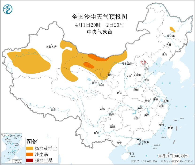 根据中央气象台4月1日18时发布的沙尘暴蓝色预警:受冷空气大风影响,预计4月1日20时至2日20时,新疆东部和南部、青海西北部、内蒙古西部、甘肃西部、宁夏北部等地的部分地区有扬沙或浮尘天气,其中,内蒙古西部、甘肃西部等地局部有沙尘暴。