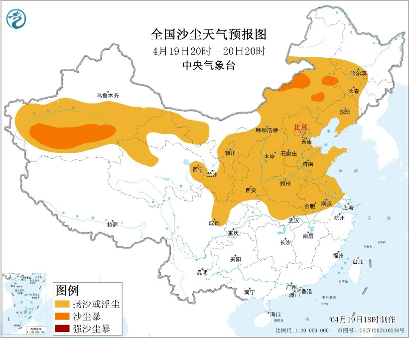 根据中央气象台4月19日18时继续发布的沙尘暴蓝色预警:受冷空气大风影响,预计4月19日20时至20日20时,新疆东部和南部、青海西北部和东部、内蒙古中东部、甘肃中东部、宁夏、陕西、山西、北京、天津、河北、山东、河南、吉林中西部、辽宁、安徽中北部、江苏中北部、湖北北部、四川盆地北部等地的部分地区有扬沙或浮尘天气,其中,内蒙古中东部、新疆南部等地的部分地区有沙尘暴。