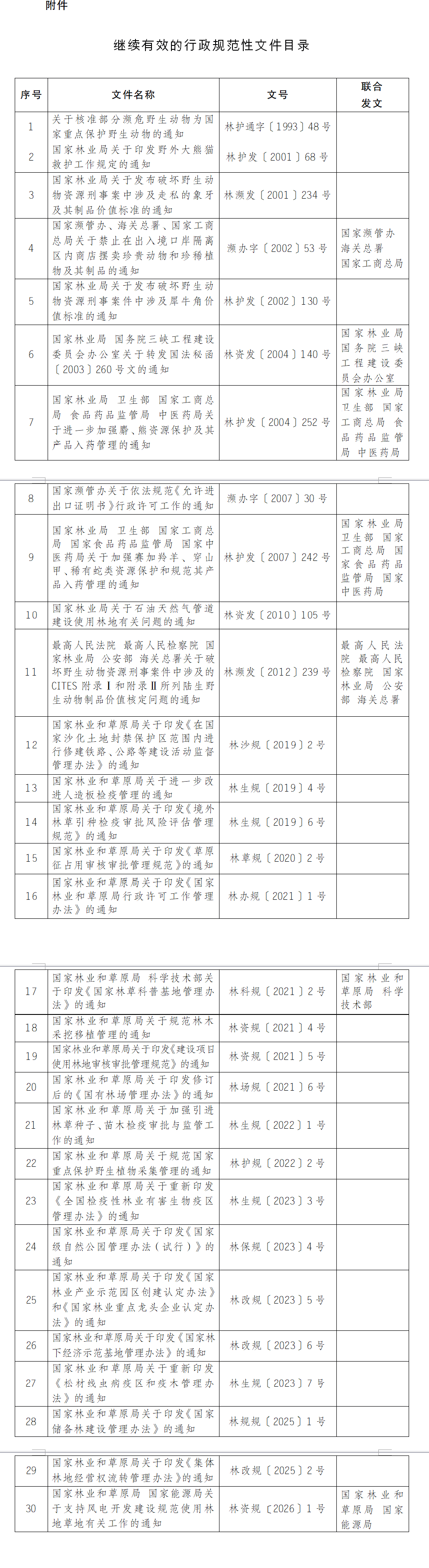 为加强行政规范性文件管理,国家林业和草原局对行政规范性文件进行了清理,现将继续有效的行政规范性文件目录予以公布。附件所列继续有效的行政规范性文件有效期至2030年12月31日。