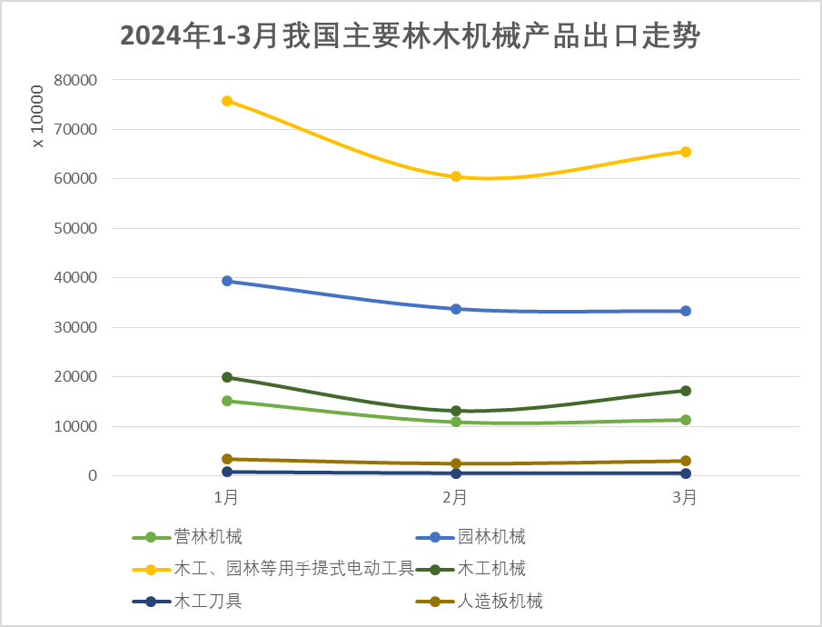2024年一季度我国主要林木机械产品进出口总额419931万美元,同比增长6.96%,其中,进口额13759万美元,同比下降18.07%;出口额406172万美元,同比增长8.08%。