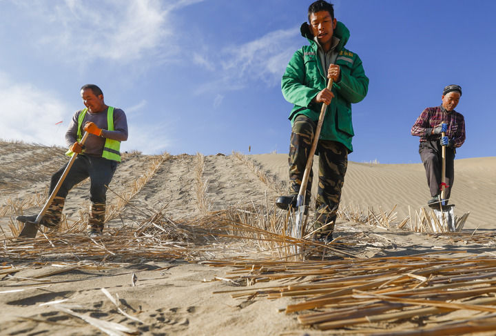 2024年12月3日,在新疆和田地区民丰县后河坝沙漠阻击区,工人在查漏补缺补扎草方格。(新华社记者王菲 摄)