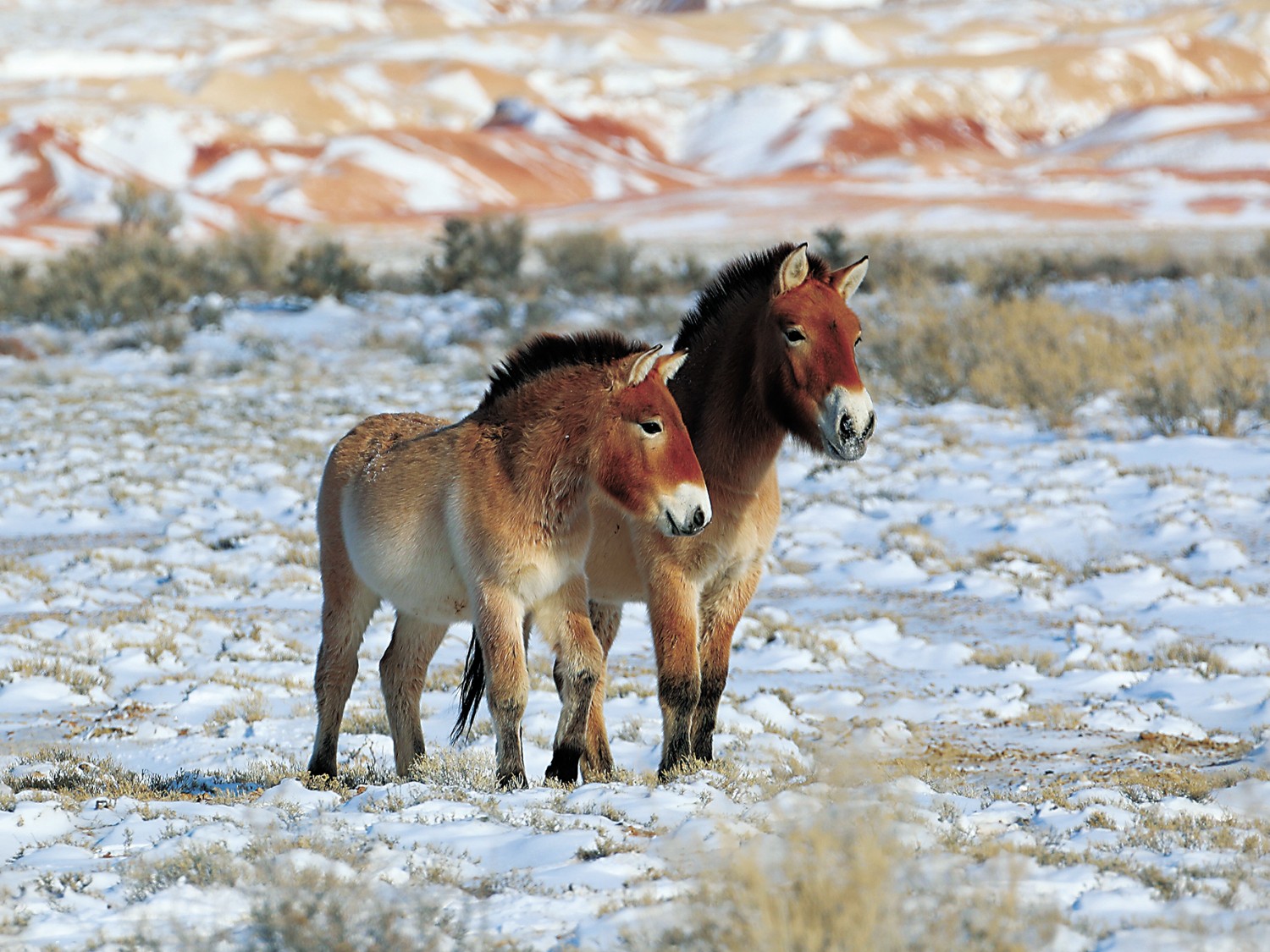 它们体格紧凑健硕,比家马略小,充满荒野所需的爆发力。头部较大,面颊短钝,口鼻尖削,配以粗大的牙齿,适合啃咬坚韧的荒漠植物。其最显著的特征莫过于毛色与斑纹:夏季背部呈浅棕色,腹部渐变为黄白色;冬季则披上长而厚的浅黄色“棉袄”。其短直如刷的鬃毛,以及束状长尾,与家马飘逸的长鬃形成鲜明对比,诉说着未经雕琢的原始野性。