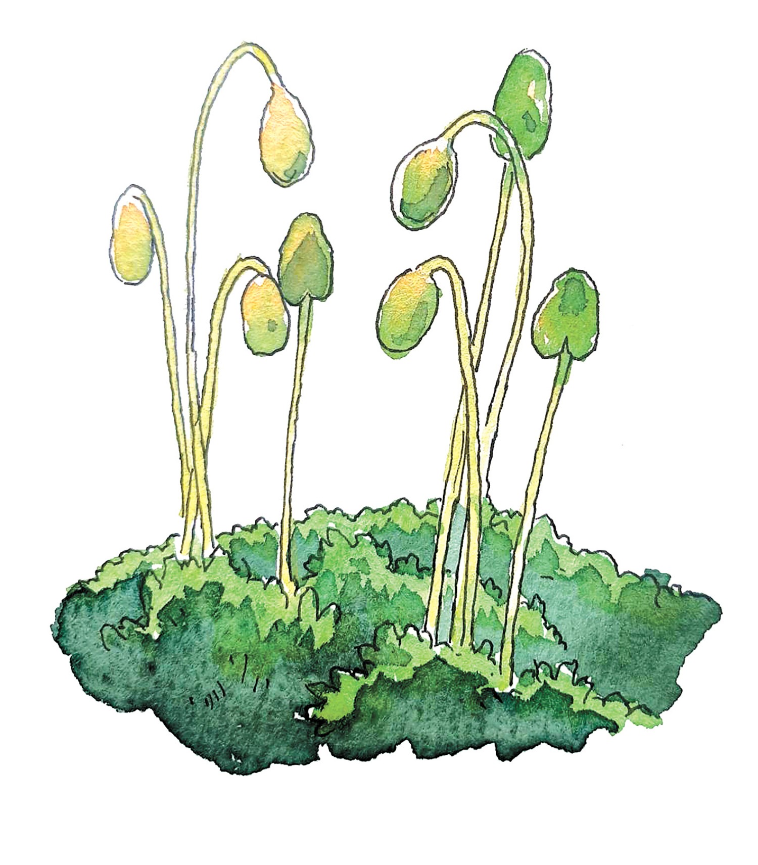在缙云山的岩石表面、石缝、树根处生长着一丛丛厚厚的绿色苔藓,像铺着一层厚厚的绿色地毯,用手掌按下去,软软湿湿的苔藓会包裹住半个手掌。此时的缙云山,降雨增多,在岩石和腐殖土表面会形成一层稳定的水膜,苔藓的孢子吸水膨胀后会打破休眠,在湿润冷凉条件下孢子开始发芽,并利用冬季柔和的散射光进行光合作用。新生的苔藓在早春快速生长,抢占光照和水分资源,从而可以巧妙地避开夏季的高温和竞争。在森林中要避免踩踏苔藓,也不要把苔藓带回家养,家里的条件不具备散射光的条件。在强光下,苔藓会快速脱水,新陈代谢暂停,处于休眠状态。