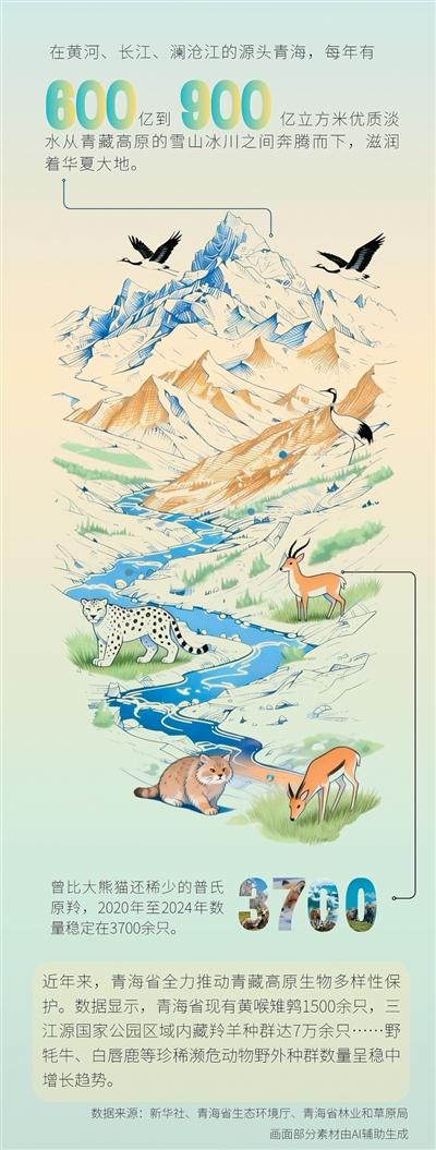 随着野生动植物栖息环境持续改善,青海省珍稀物种种群呈稳步恢复态势,生物多样性家底持续夯实。截至目前,三江源国家公园区域内,雪豹约1000只,藏羚羊种群达7万余只,野牦牛1万余头,藏野驴3万—4万头,白唇鹿1万余只。