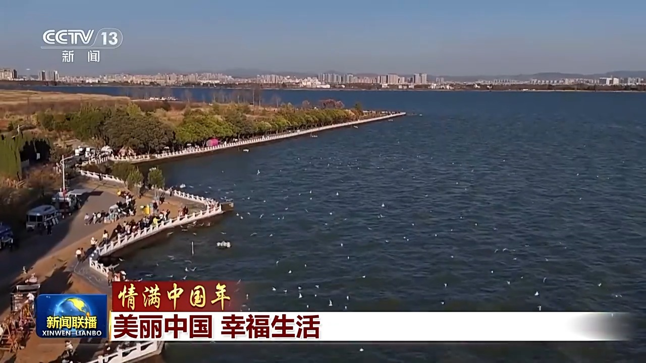 春节假期,云南昆明滇池沙鸥翔集、碧波荡漾。在紧邻滇池的福保社区,人们跳起民族舞蹈,喜迎八方来客,共赏滇池生态美景。