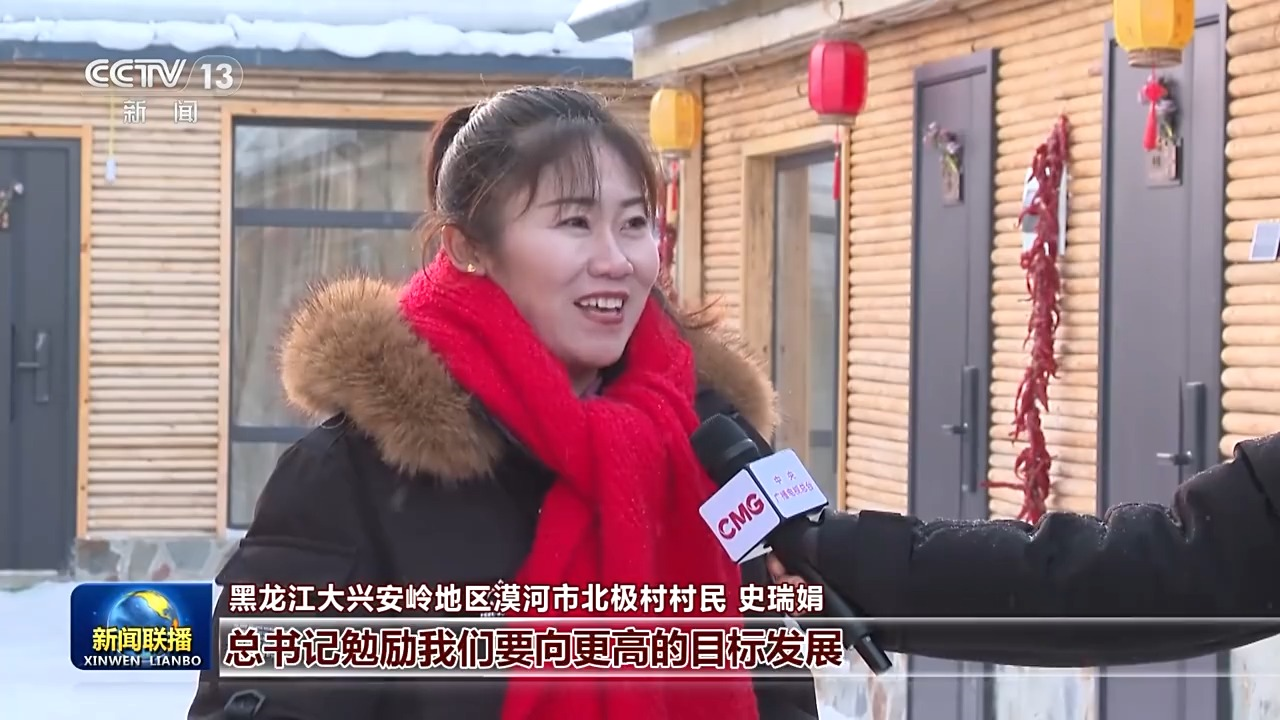 黑龙江大兴安岭地区漠河市北极村村民 史瑞娟:总书记勉励我们要向更高的目标发展,极大激励了我们的干劲儿。我们北极村的生态越来越好,人气越来越旺。现在我们周边的邻居都有民宿、餐饮、山特产品等各种各样的产业,村民的日子也越来越红火。