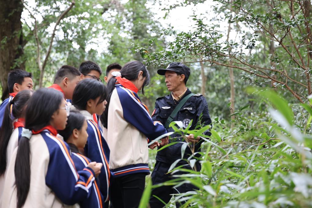港背村生态护林队队长包训详(右一)在给孩子们上生态课。新华社发