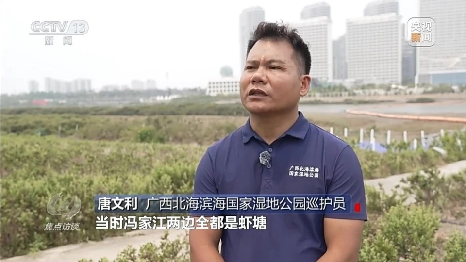 广西北海滨海国家湿地公园巡护员 唐文利:当时冯家江两边全都是虾塘,家家户户都养虾,虾塘的水全部都排进河里,后来全拆了,变成现在的湿地公园。