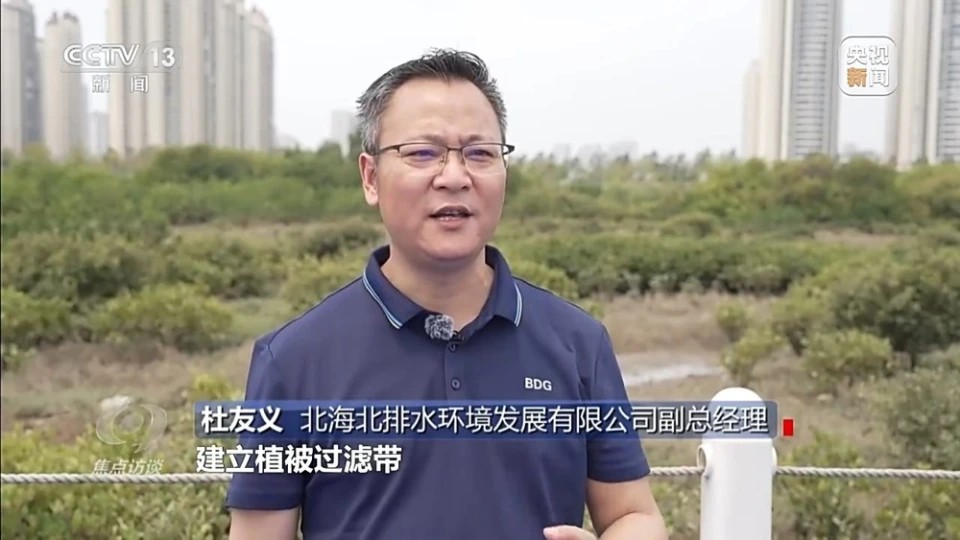 北海北排水环境发展有限公司副总经理 杜友义:上游区域,拆除了两岸明渠的违章建筑,建立植被过滤带;中段区域,拆除虾塘水泥护砌,改造为沿海滩涂湿地和生态湿塘,恢复自然生态交换;下游区域,采用自然演替的方式,种植适生红树林和本地棕榈科植物,逐步形成抗台风、耐盐碱的植物群落。