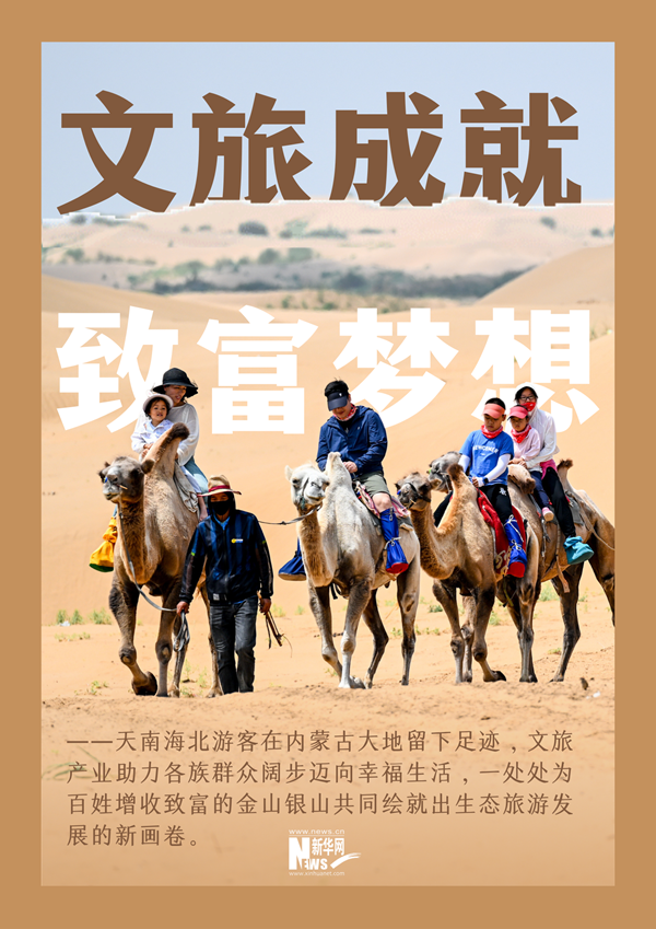 雄壮巍峨的阴山山脉,蜿蜒曲折的黄河几字弯,万木葱茏的大兴安岭,沃野千里的河套良田,一碧万顷的乌梁素海,望不到边的辽阔草原,浩瀚无垠的库布其沙漠……今天的内蒙古,一处处景色宜人的绿水青山逐渐成为重要的文旅资源,来自天南海北的游客在内蒙古大地留下足迹,文旅产业助力各族群众阔步迈向幸福生活,一处处为百姓增收致富的金山银山共同绘就出生态旅游发展的新画卷。