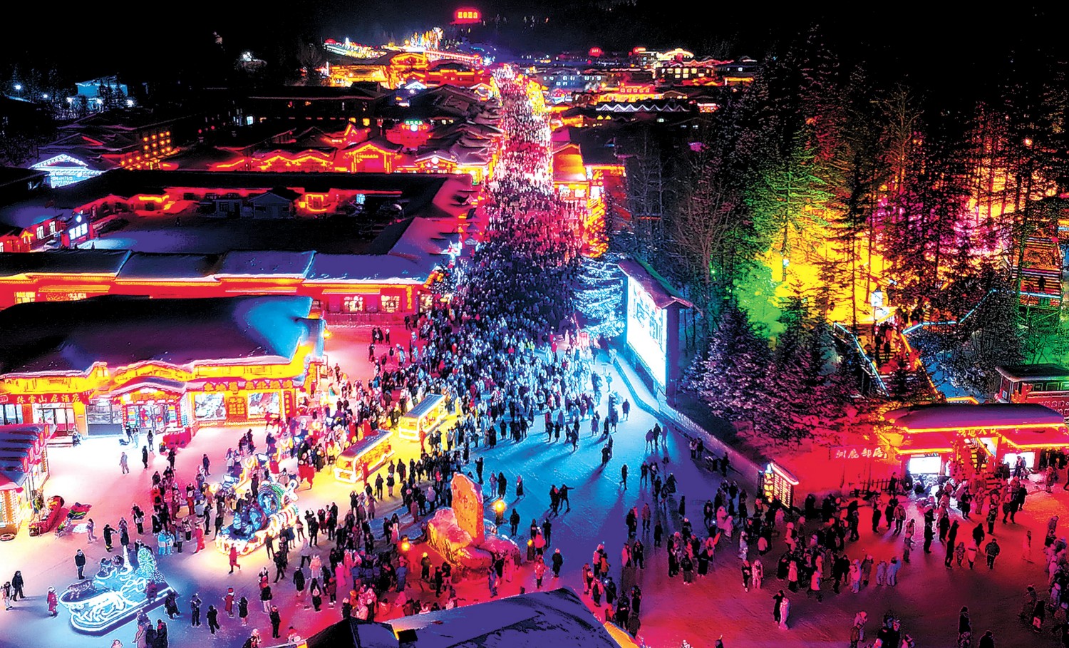 雪韵大街上,舞狮、踩高跷、大花轿、安塞腰鼓、东北大秧歌轮番上演,火红绸带与白雪相映成趣。夜间的雪地蹦迪、烟花秀、激光秀更是点燃了冬日激情。爱心驿站、免费行李托运、“有事找我”等贴心服务,让游客在赏雪乐雪之余倍感雪乡温暖。 (王天驰)