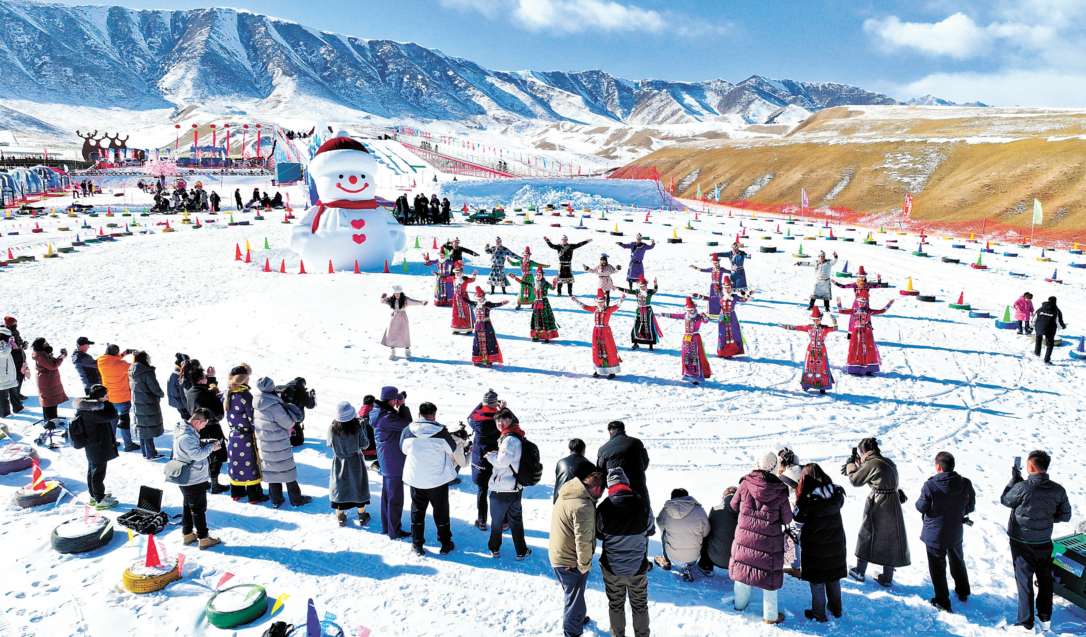近日,甘肃省张掖市肃南裕固族自治县祁连山鹿文化生态旅游区神鹿冰雪王国大雪人广场上,裕固族、藏族、蒙古族等民族的游客们跳起欢乐的锅庄舞。