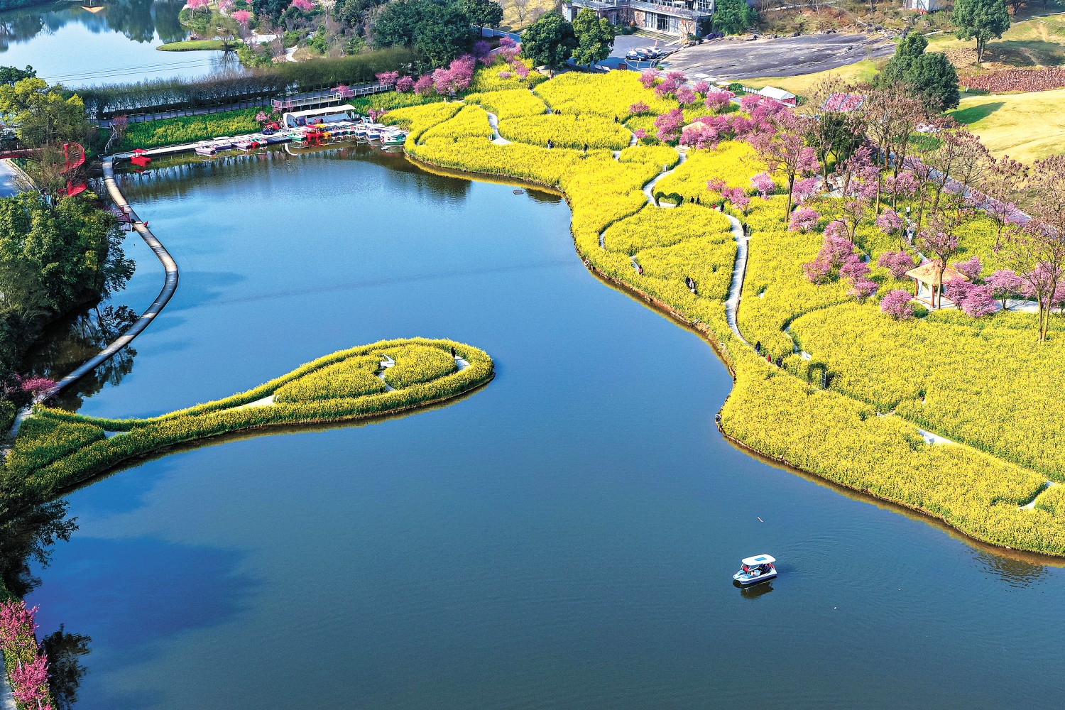 春日里,云林天乡景区吸引众多游客前来踏青赏花、休闲观光。人们在花海湖畔漫步游玩,尽享自然生态之美。这一景象生动展现了当地生态文明建设带来的成效,也是绿水青山向金山银山转化的生动实践。 (刘琳摄)