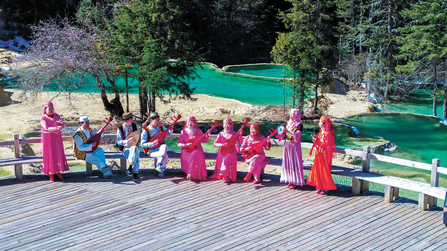 松潘县民间腰鼓队在黄龙迎宾池表演 四川省林草局供图