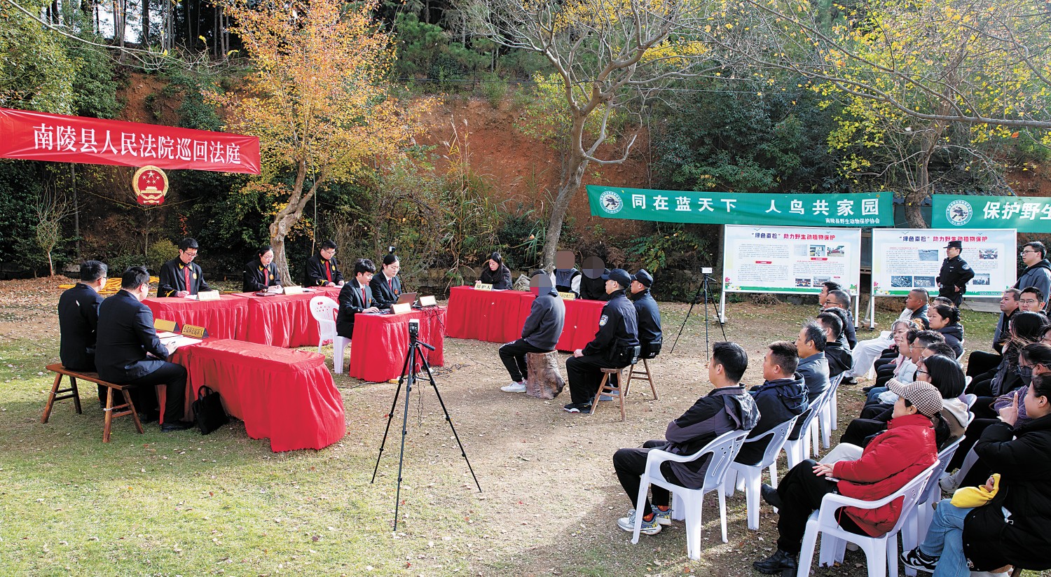 近日,安徽省南陵县人民法院“巡回法庭”在三里镇漳溪村牛头山公开审理了一起非法狩猎野生鸟类案。法院当庭以非法狩猎罪判处被告人沈某拘役2个月,依法予以没收作案工具,同时判令其和另外2人连带承担生态环境损害赔偿金2700元。30余名镇、村干部,附近村民及野生动物保护志愿者全程见证庭审现场。