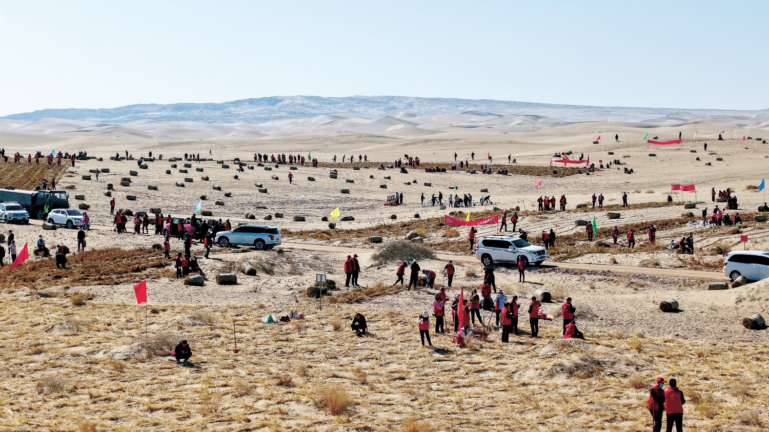 3月9日,甘肃省武威市组织干部职工1.1万余人,分别在民勤县时光廊道、凉州区九墩滩光伏治沙示范园区、东北部沙区等区域,全面开展春季义务压沙植树活动。