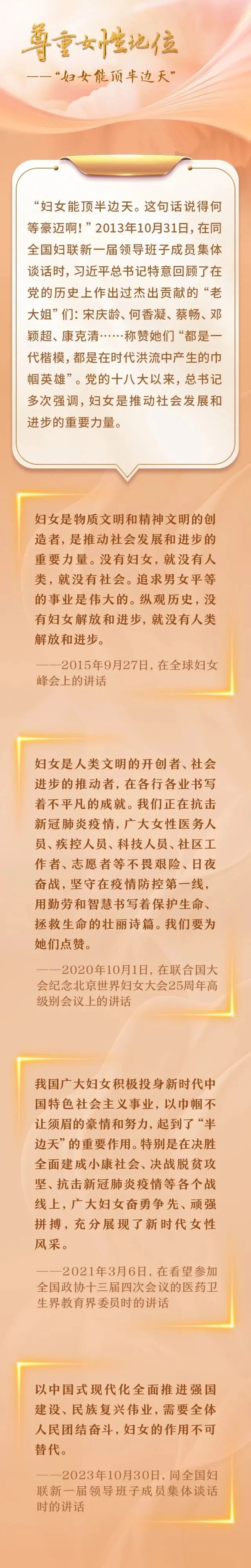 每年一个春天的约定,习近平总书记向广大妇女致以节日的问候,送去温暖的关怀、激励的话语。每年全国两会,女代表、女委员为民履职的身姿,都是一道亮丽的风景线。每当国有大事,中国女性力量从未缺席。新征程上,妇女是时代的书写人、追梦的奋斗者。