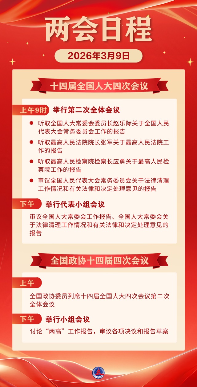 新华社北京3月8日电 9日上午9时,十四届全国人大四次会议在人民大会堂举行第二次全体会议,听取全国人大常委会委员长赵乐际关于全国人民代表大会常务委员会工作的报告,听取最高人民法院院长张军关于最高人民法院工作的报告,听取最高人民检察院检察长应勇关于最高人民检察院工作的报告,审议全国人民代表大会常务委员会关于法律清理工作情况和有关法律和决定处理意见的报告。