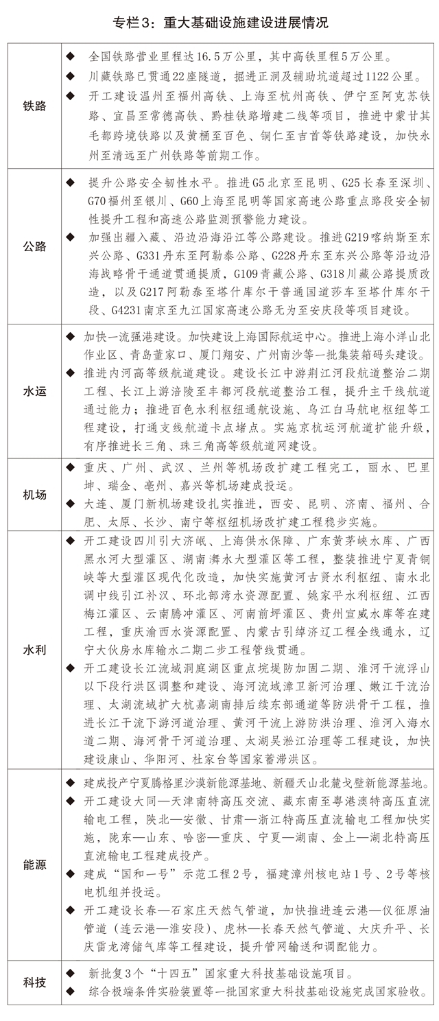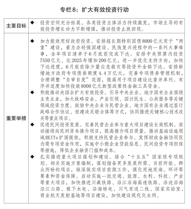二是投资补短板调结构加力增效。统筹用好各类资金支持重点项目建设,持续优化中央预算内投资结构,扩大地方政府专项债券投向领域和用作资本金范围,指导专项债券“自审自发”地区扎实有序开展相关工作。推动“十四五”规划102项重大工程项目顺利实现规划目标任务,开工建设雅下水电等标志性工程。现代化基础设施体系建设深入推进,国家综合立体交通网“6轴7廊8通道”加速完善。规范和加强中央投资项目审批管理,提高政府投资效益。出台进一步促进民间投资发展政策措施。滚动向民间资本推介5400多个项目,涉及总投资超过3.9万亿元。加大基础设施竞争性领域向各类经营主体公平开放力度,5个新核准核电项目引入民间资本参股比例最高达20%,大渡河丹巴水电站等项目加快引入民间资本。推动基础设施领域不动产投资信托基金(REITs)扩围扩容,算力设施、城镇供热、农贸市场、城市更新、专业仓库等领域实现“首单”发行。2025年工业投资、制造业投资分别增长2.6%、0.6%。