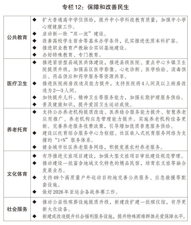 二是构建优质均衡公共服务体系。稳步推进基本公共服务均等化。适应学龄人口变化,优化学前和义务教育资源配置,增加普通高中学位供给和优质高校本科招生。全面推进健康学校建设。深化实施医疗卫生强基工程,完善国家区域医疗中心管理体制和运行机制,促进优质医疗资源扩容下沉和区域均衡布局,加强县区、基层医疗机构运行保障。支持心理健康和精神卫生、妇女儿童健康服务体系建设,实施康复护理扩容提升工程。健全公共卫生防控救治体系。加强慢性病、罕见病防治,全方位提升急诊急救、血液保障和应急能力。推进中医药传承创新,促进中西医结合。推出促进银发经济高质量发展的增量政策,培育发展银发经济龙头企业,推进老年人力资源开发,更好满足老年人多元化需求。发展医养结合服务,推行长期护理保险,健全失能失智老年人照护体系。实施早孕关爱行动、孕育和出生缺陷防治能力提升计划。发挥育儿补贴作用,完善生育保险、生育休假等制度。推进普惠养老托育服务体系建设,提升社区养老托育等服务能力。加强公共设施适老化和无障碍改造。推进高质量户外运动目的地建设,开展群众身边体育运动空间扩容。积极培育群众赛事。深化家政产教融合,持续推进家政服务业提质扩容。完善困境儿童服务保障体系,支持社会福利设施建设。