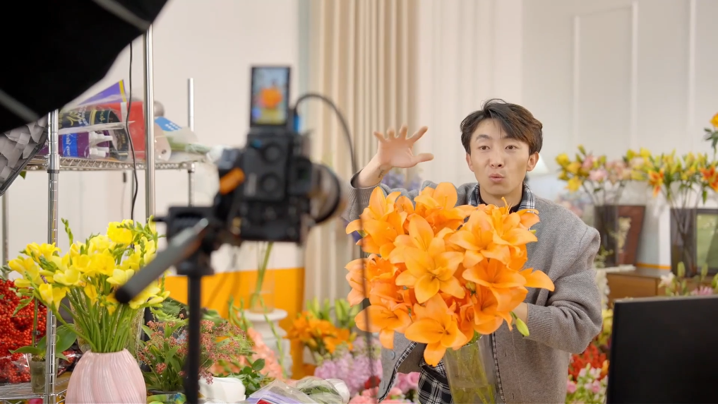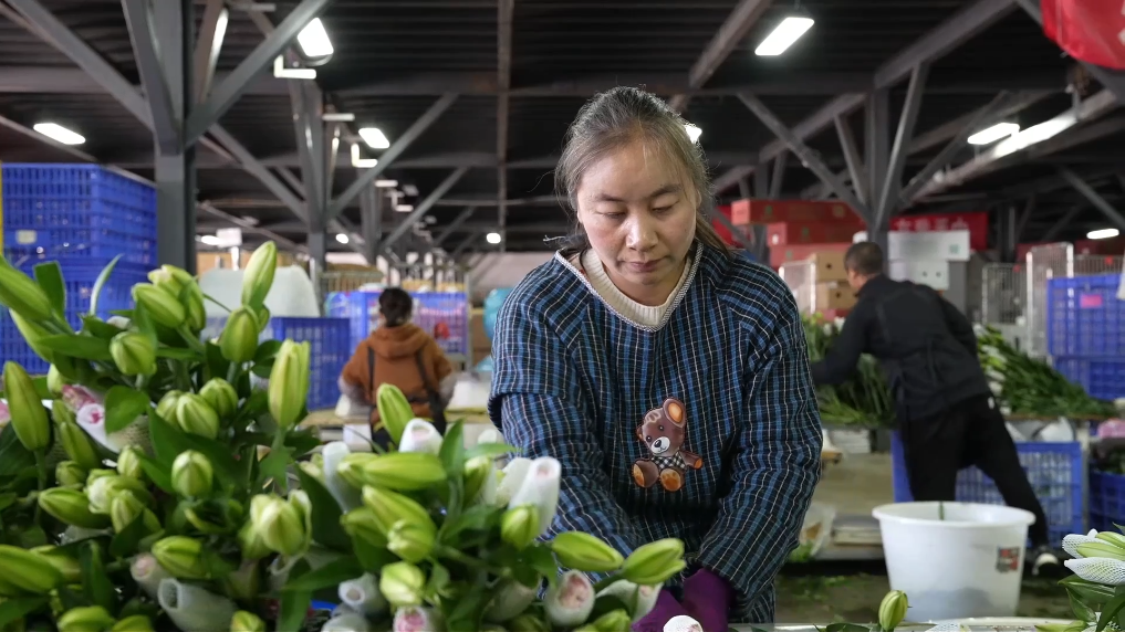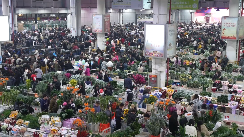 温室中科技赋能培育的蝴蝶兰等年宵花供不应求,工人们正加紧包装发往全国。线下市场里,腊梅、百合等备受青睐,市民游客争相选购。线上直播间同样火爆,电商通过“仓储-直播-发货”一体模式,让红腊梅等鲜花日均销售额达数百万元。