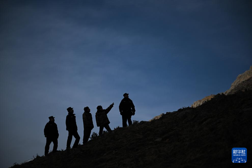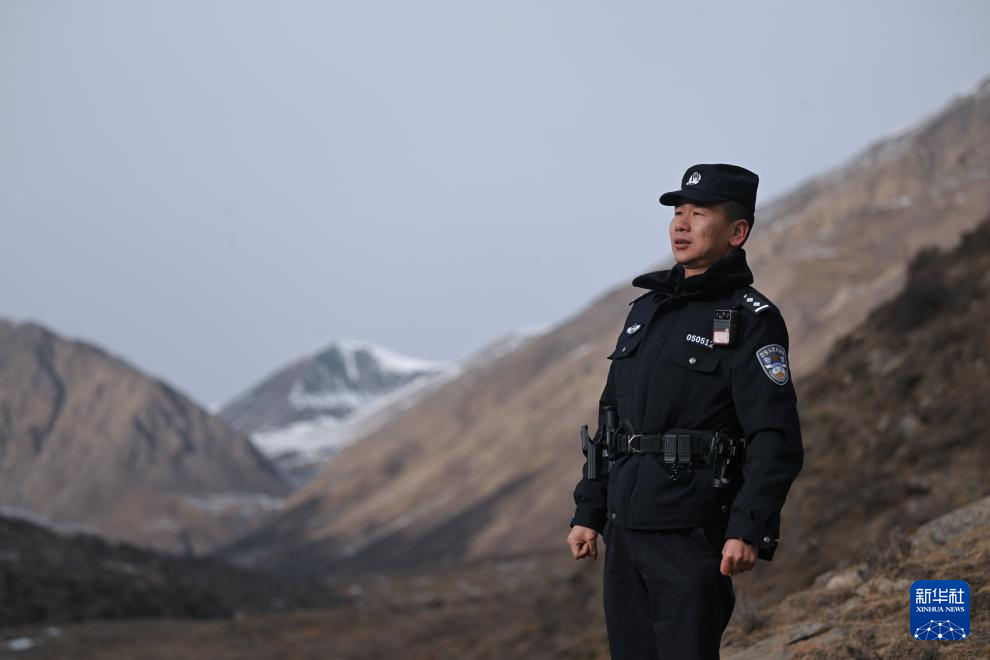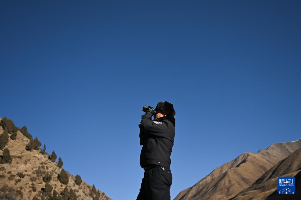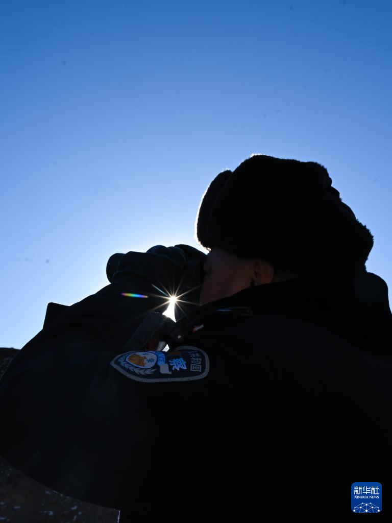 1月9日,在青海省海北藏族自治州门源回族自治县境内的老虎沟,民警郭建业在用望远镜查看远处。