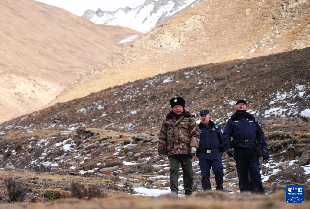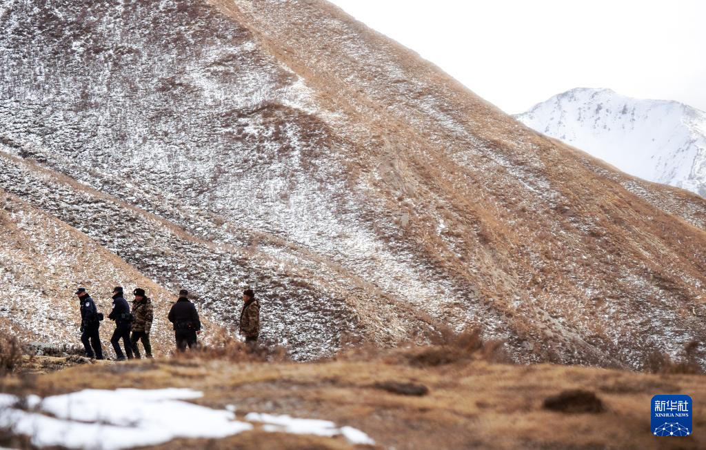 1月8日,在青海省海北藏族自治州门源回族自治县境内的老虎沟,民警魏磊(中)、郭建业(右)和生态管护员李占云(左)在巡护祁连山。