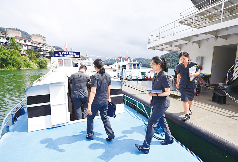 群众身边的“小案”,件件关乎民生、连着民心。湖南省益阳市安化县柘溪水库沿岸有8个乡镇。为满足库区沿岸17万多群众的司法需求,安化县人民法院设立了巡回水上审判庭,当地群众称其为“水上法庭”。图为2023年7月19日,安化县人民法院干警在柘溪客运码头登上“水上法庭”。 新华社记者 薛宇舸/摄