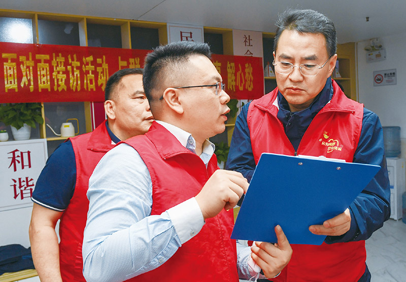 学习贯彻习近平新时代中国特色社会主义思想主题教育开展以来,深圳市宝安区学习践行“四下基层”,开展“心安夜话”接访活动,与群众面对面聊民生、听诉求、谈建议。图为2024年1月17日,在接访活动中,接访的街道干部、“两代表一委员”就居民提出的问题进行商讨。 新华社记者 毛思倩/摄