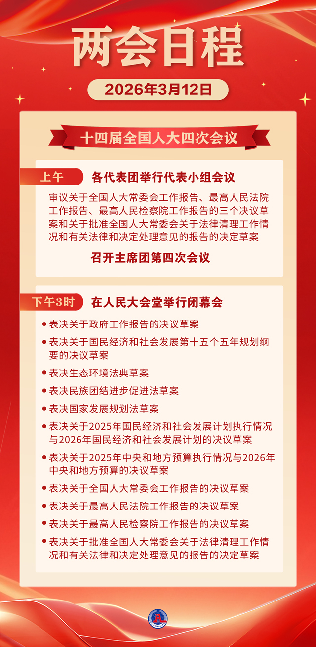 12日下午3时,十四届全国人大四次会议在人民大会堂举行闭幕会,表决关于政府工作报告的决议草案,表决关于国民经济和社会发展第十五个五年规划纲要的决议草案,表决生态环境法典草案,表决民族团结进步促进法草案,表决国家发展规划法草案,表决关于2025年国民经济和社会发展计划执行情况与2026年国民经济和社会发展计划的决议草案,表决关于2025年中央和地方预算执行情况与2026年中央和地方预算的决议草案,表决关于全国人大常委会工作报告的决议草案,表决关于最高人民法院工作报告的决议草案,表决关于最高人民检察院工作报告的决议草案,表决关于批准全国人大常委会关于法律清理工作情况和有关法律和决定处理意见的报告的决定草案。
