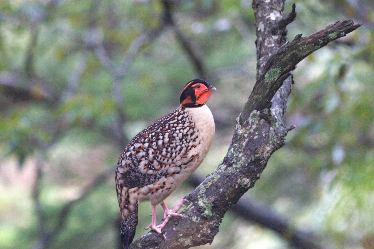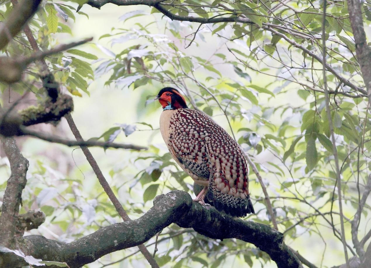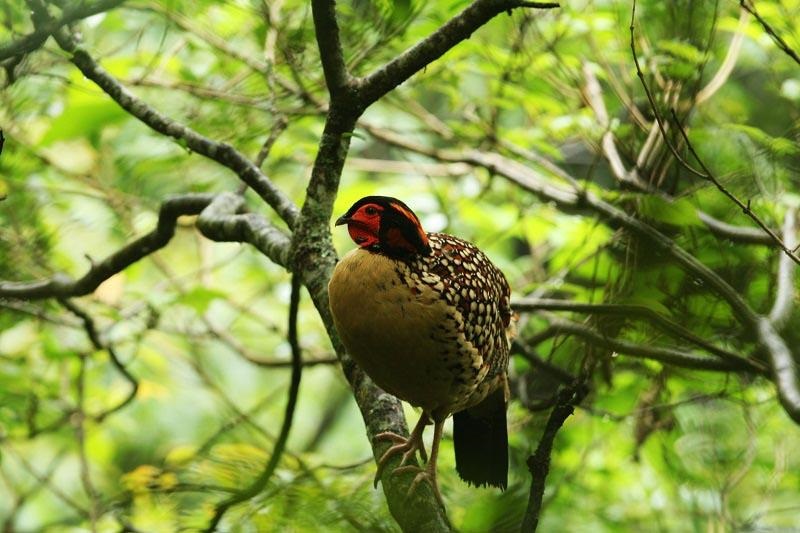 繁殖期在树上警戒的雄性黄腹角雉