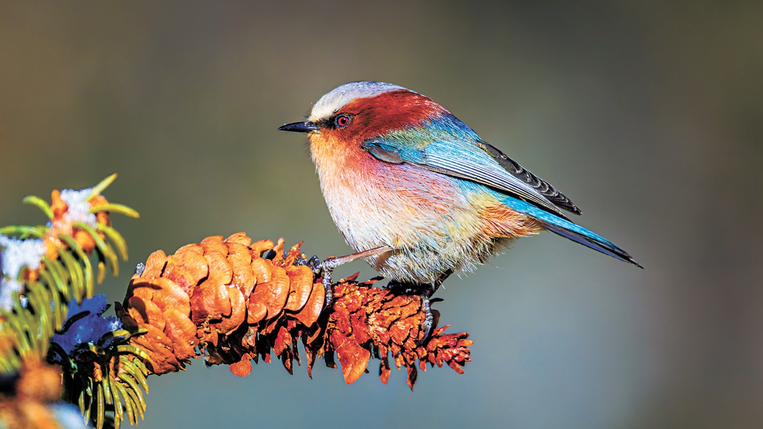 海拔3000米上下的针叶林带,松枝凝霜、雪色如素,构成一幅清寂的冬日长卷。体长仅约10厘米的凤头雀莺,恰似画卷中泼洒的浓墨重彩。这群被誉为“祁连山精灵”的鸟儿,头顶雪白羽冠蓬松如绒,棕红面颊温润似玉,蓝绿背羽泛着金属光泽,淡粉与橙白相间的腹羽柔和雅致,在纯白背景的映衬下,形成强烈而和谐的视觉碰撞。它们或亭亭立于覆雪松枝,或灵巧穿梭于松针间隙,更有灵动的个体俯身探喙,啄取松针缝隙里的昆虫。一声清脆啄击,划破林间的清寂,却凸显山野幽静。羽翼轻振间,将雪中觅食的鲜活图景永久定格。