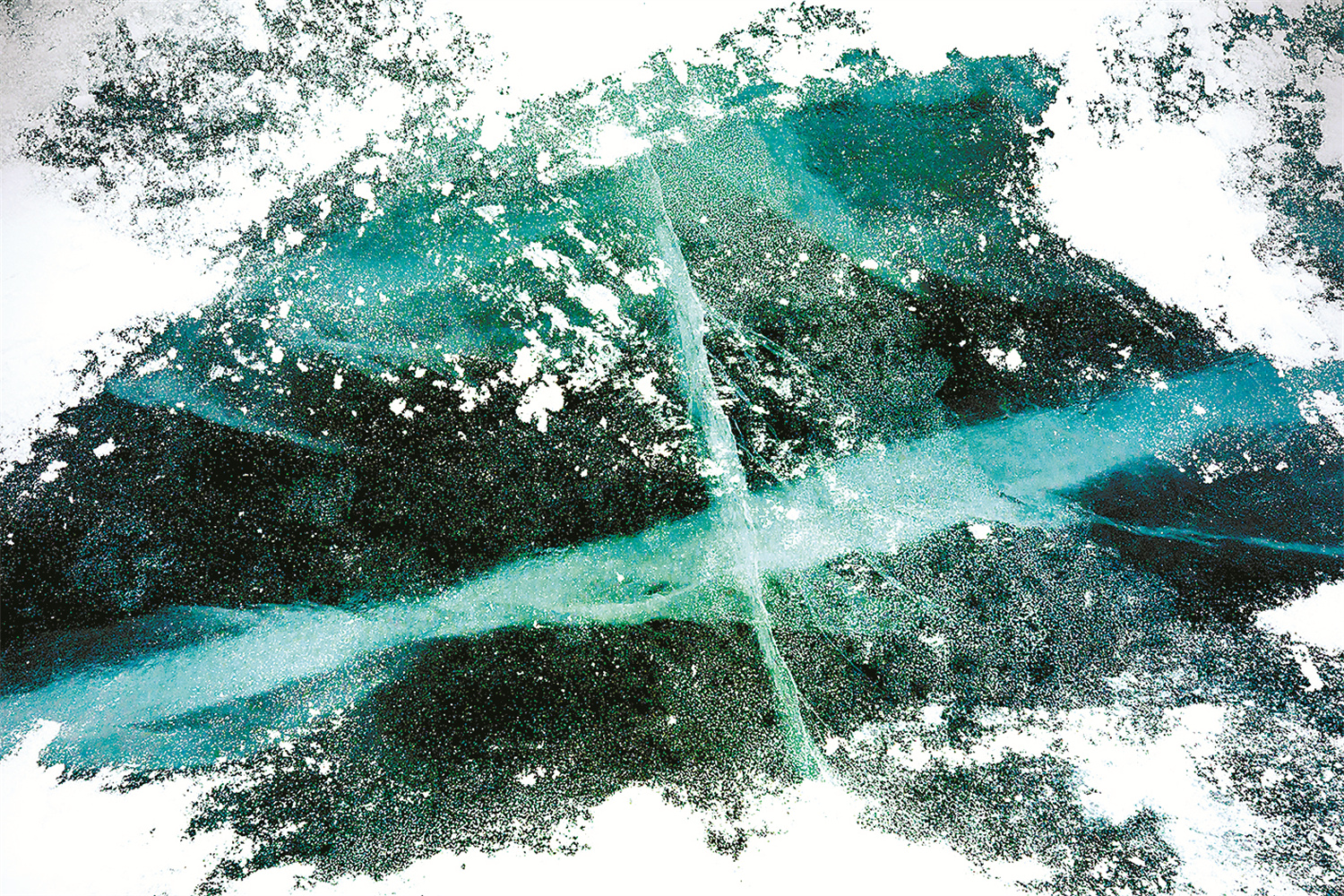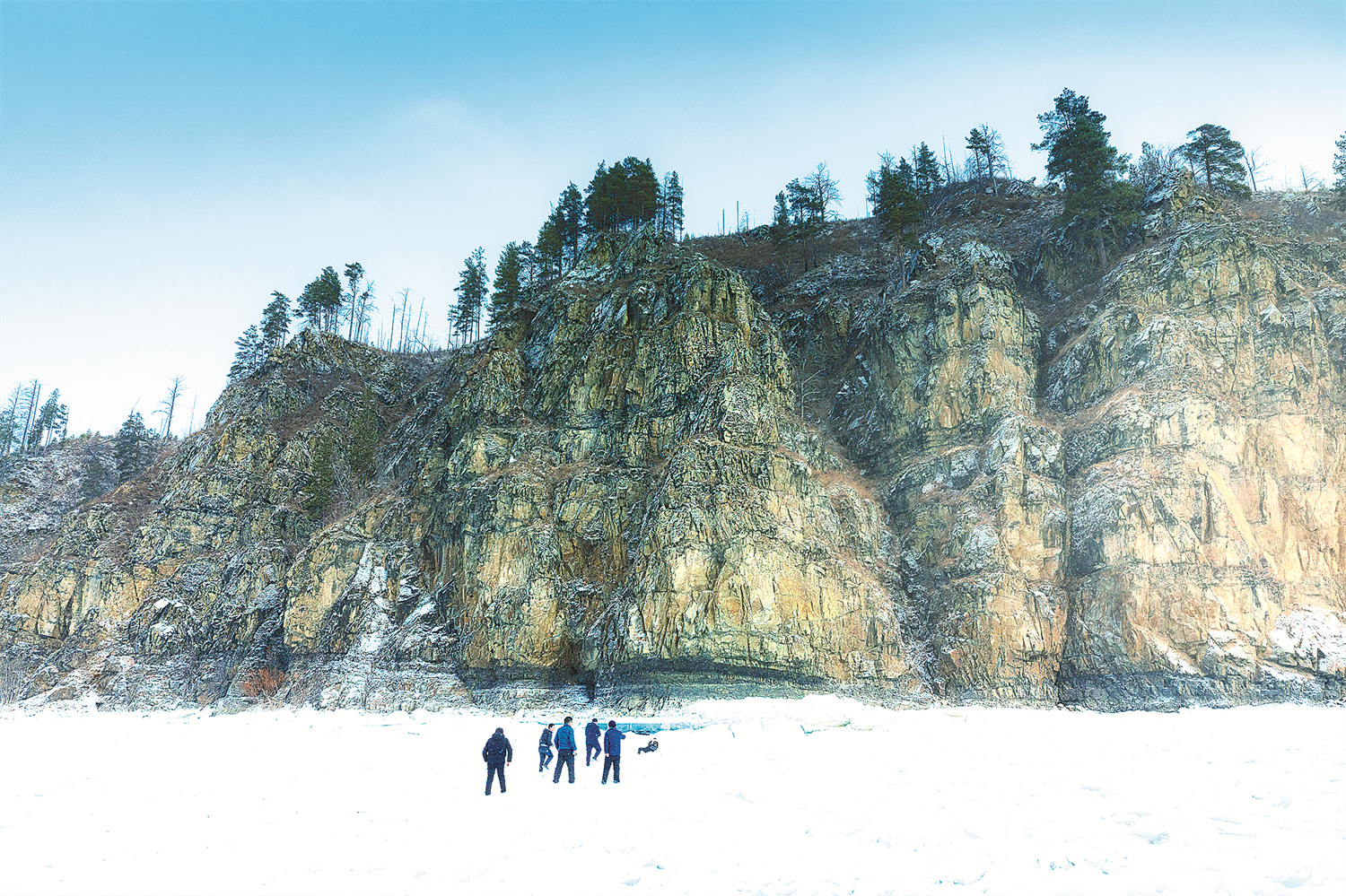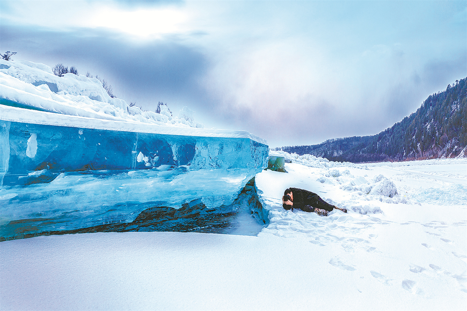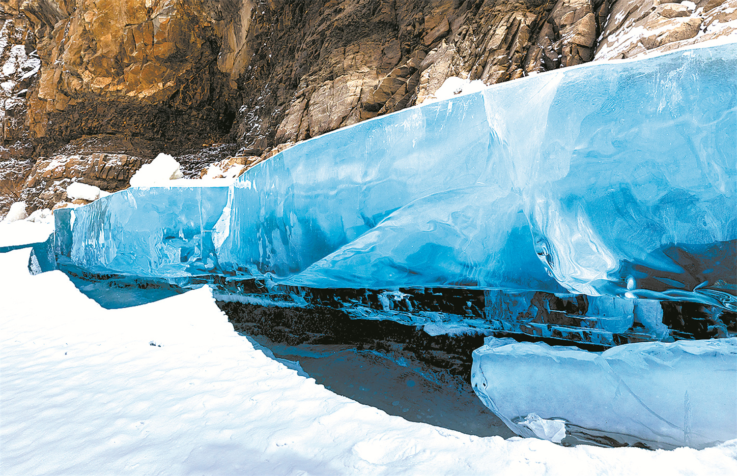 大块蓝冰表面光滑如镜,能将人的五官轮廓清晰地呈现出来。有趣的是,当人体角度倾斜到一定程度时,它便会产生哈哈镜的效果,人们仿佛变成了胖瘦不一的“蓝精灵”。断裂的冰层与地面拉开了巨大的缝隙,形成了天然狭长的冰洞,爱好拍摄的同事爬进爬出,尽情体验蓝洞冰屋的乐趣,喜悦的余音一波接着一波,荡漾在冰雪山地之间。而拍摄蓝冰的最佳状态,是在日出日落时,朝霞中有云彩点缀,此时岸边的蓝冰地带更加出彩,蓝冰如梦如幻,美到了极致。(王兴泽)