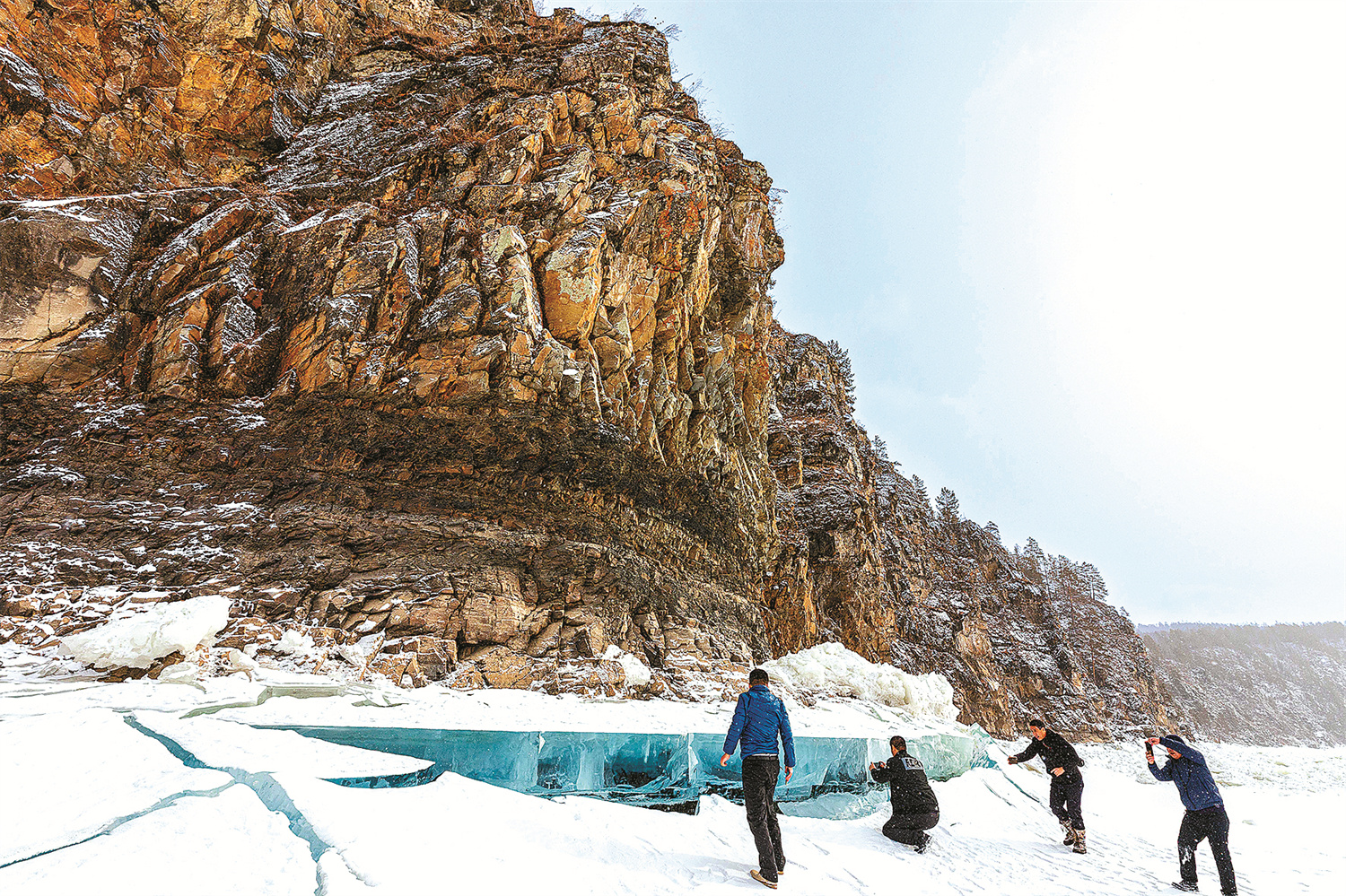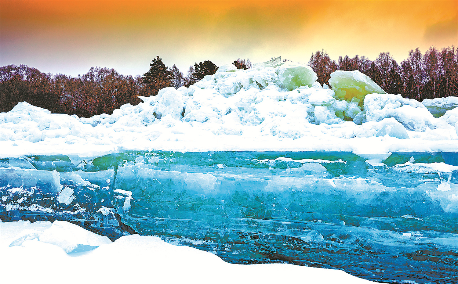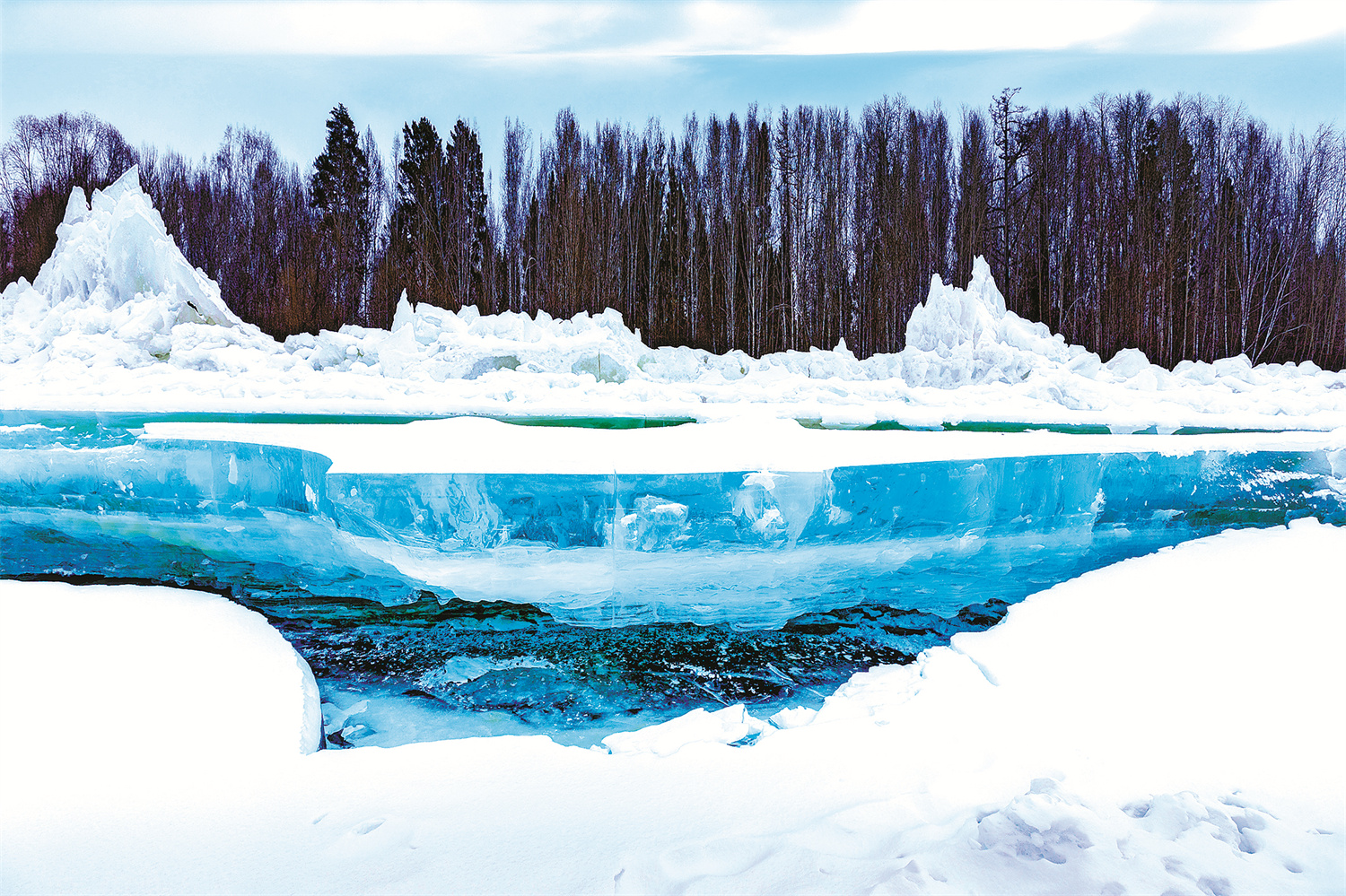 “神州北极”的蓝冰奇观,巨大的冰墙从江面隆起,在光线散射下呈现出通透的幽蓝色,在极寒天气下形成了独特景观