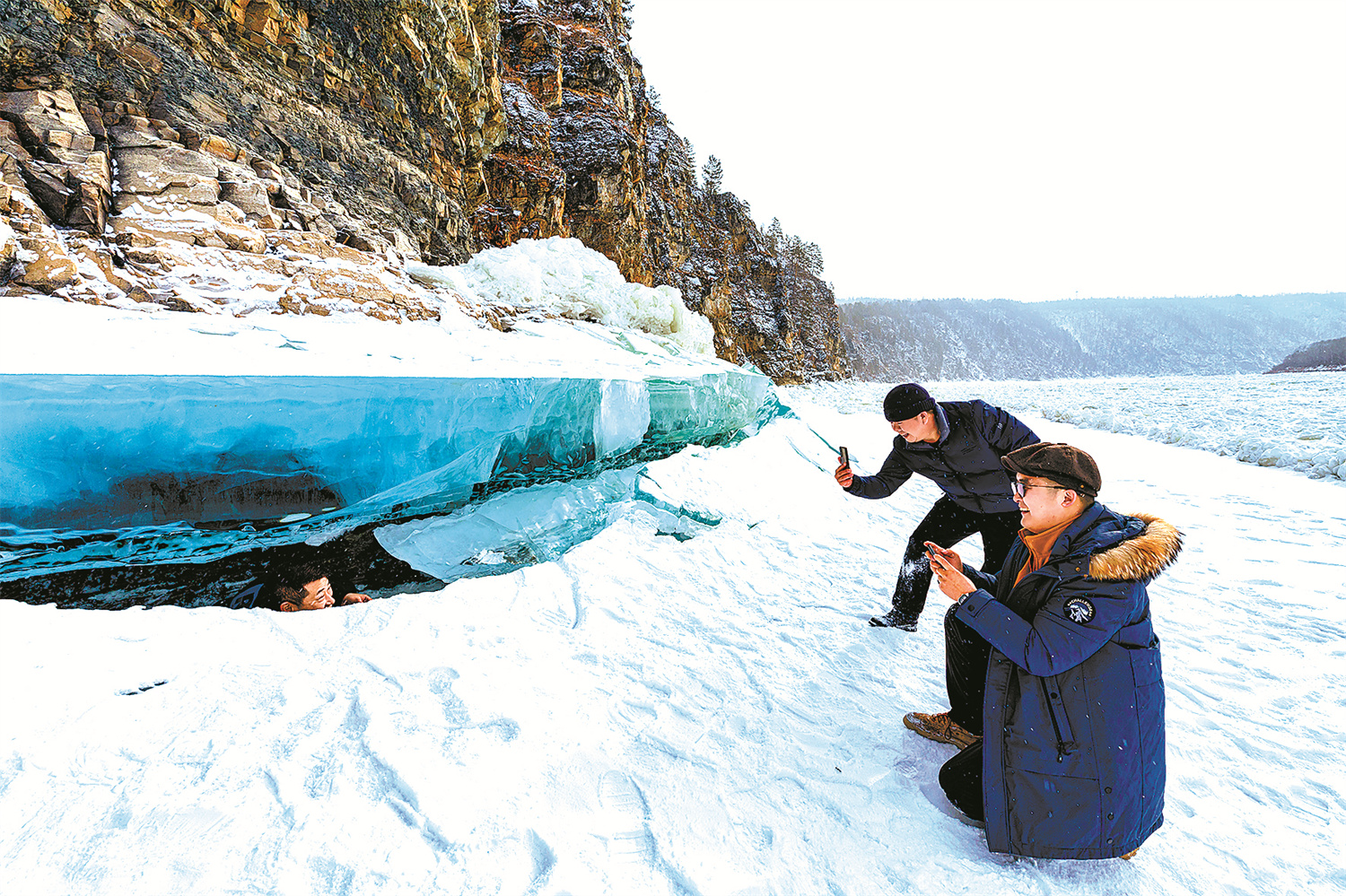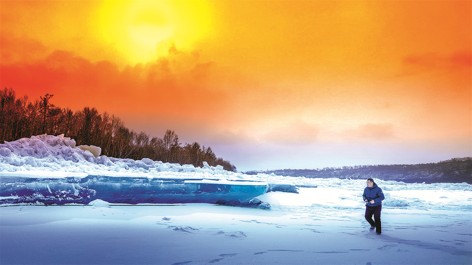 随着朝霞缓缓升起,眼前的雪花时有时无,伴着暖阳在冰冻的江面上零星飘落。这是我人生中首次在“中国北极53°”环岛界江冰道上,亲身感受自驾穿越冰雪赛道的刺激与乐趣。当亲眼目睹蓝冰奇景时,一种兴奋与敬畏之情在我心中油然而生。当“蓝冰”二字传入耳中,为了能够收集中国北极蓝冰的第一手资料,我和同事们顺着专家手指的方向极目远眺,蓝光隐约闪烁,我们纷纷跳下车,不顾凛冽寒风的侵袭,像下饺子一般,“扑通扑通”地双腿插进厚厚的积雪中,头也不回地奔向蓝冰。一个个如同打了鸡血般兴奋,手持长枪短炮般的摄影设备,穿过被旋风裹挟的厚厚积雪,举步维艰,脚步细碎。鞋子灌进了冰雪,雪花打湿了双脚,却毅然不顾寒意萦绕全身,依旧慢慢靠近有蓝冰的岸边,快速抓拍这极难偶遇的蓝冰美景。嘴里还不停地嘟囔着:“太美了,太美了……”