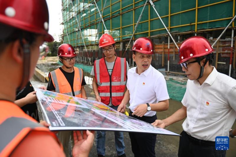在浙江省宁波市奉化区萧王庙街道滕头村,二十大代表、滕头村党委书记、村委会主任傅平均(右二)在村党群服务中心大楼建设工地察看施工进展(2022年9月16日摄)。新华社记者 黄宗治 摄