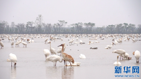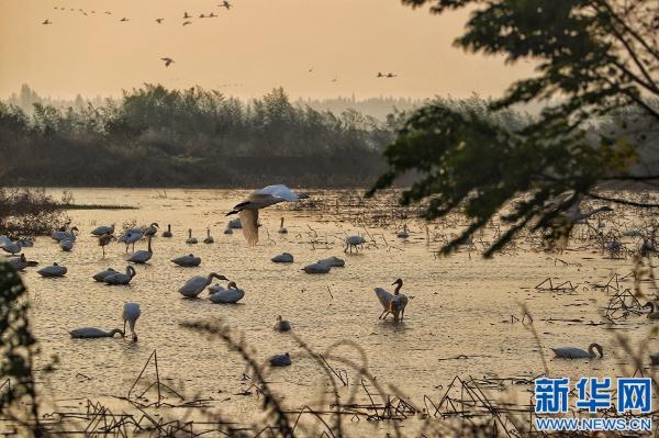 候鸟在鄱阳湖畔的南昌高新区五星白鹤保护小区栖息、觅食。新华网 王晓震 摄